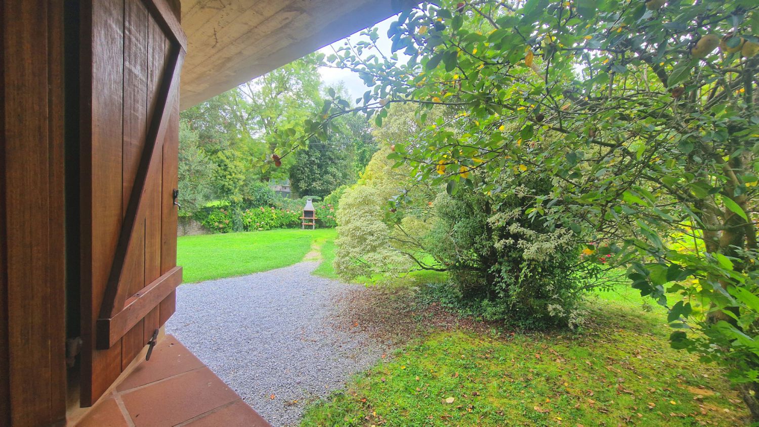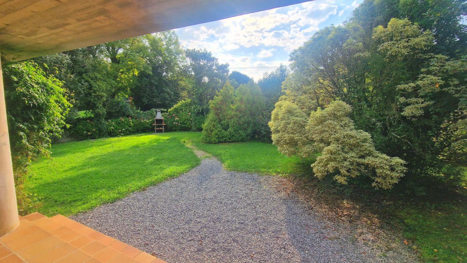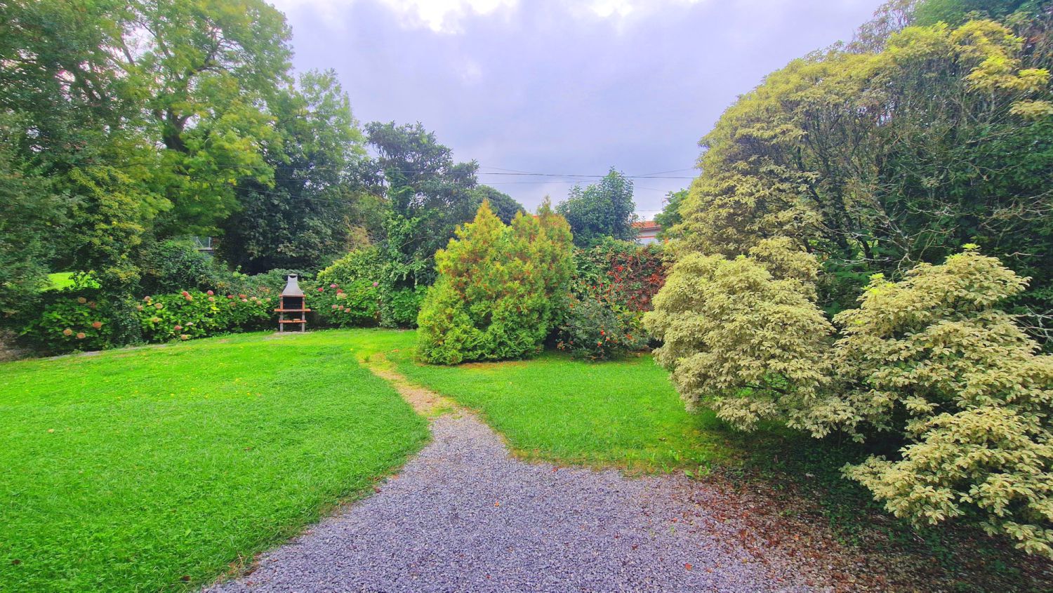 Dispone de jardín junto a la casa con barbacoa, dentro de una parcela de aproximadamente 3.100 m2, donde se ubica la casa, principalmente en una planta ya que dispone de cinco dormitorios y tres baños en ésta, tiene también una planta alta con dos dormitorios y una planta semi sótano donde se ubica el garaje trastero y cuarto de plancha y lavado.